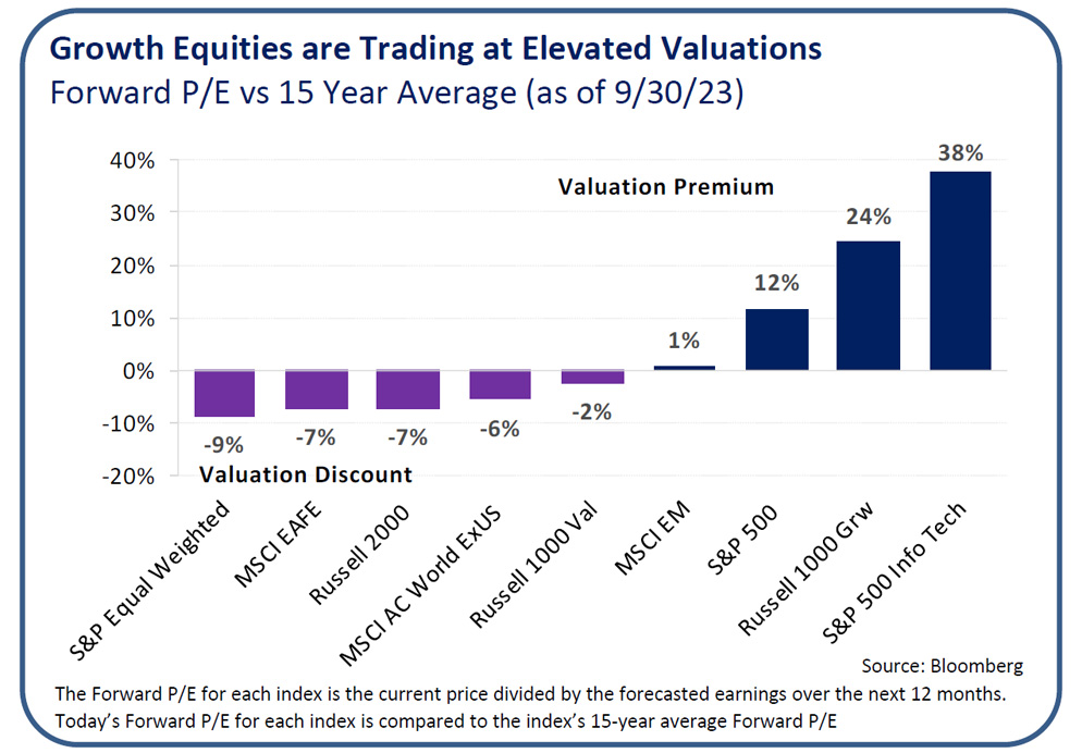 Market breadth continues to be narrow, and in last quarter’s Viewpoints, OAM Research highlighted the magnitude of the impact that the “Magnificent Seven” had on S&P 500 performance. With the sharp recovery of these stocks over the last year, large cap growth equities are back to trading at elevated valuations. As the market digests the potential for “higher for longer” interest rates and assesses the lagged impact of monetary policy making its way through the economy, OAM Research believes that investors should ensure diversification across more reasonably priced asset classes that could prove more resilient during a slowdown.
