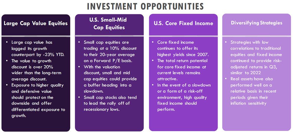 Small and mid-cap stocks are trading at discounts relative to large caps and to their own history. Smaller companies are facing the same headwinds as their larger counterparts, primarily due to the impact of higher interest rates, higher cost of labor and lending pressures but are navigating the environment with less diversified product lines. Smaller cap stocks tend to underperform as economic growth slows, so neutral positioning is warranted despite more attractive valuations.